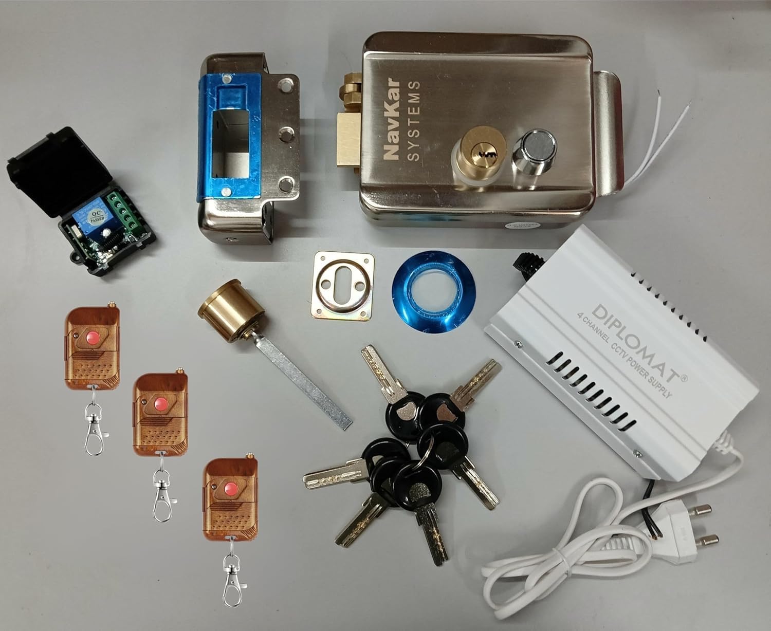 Navkar Systems CN59 Electronic Door Lock for House Main Metal Gate | Remote Control Door Lock for House Main Gate | Includes Receiver + 3 Remotes + 12V Power Supply